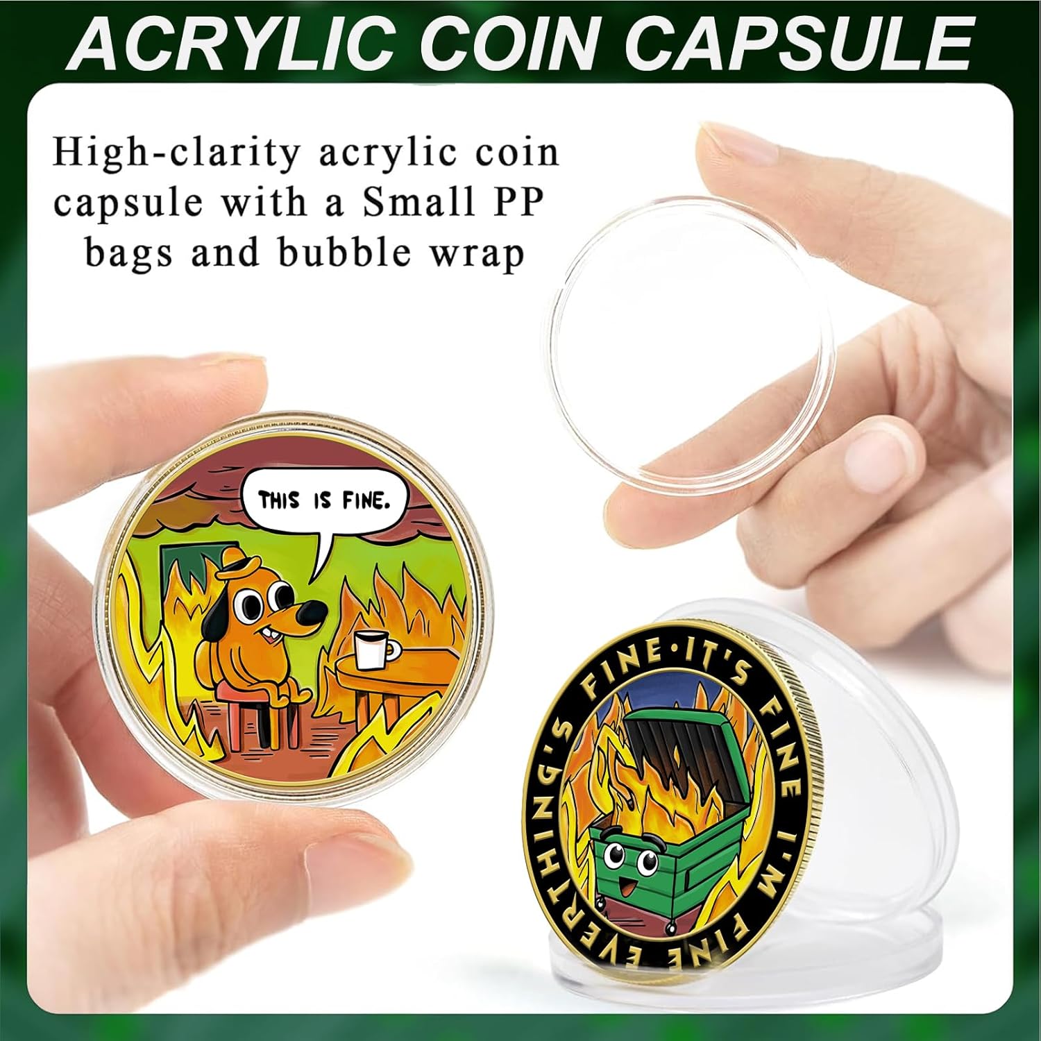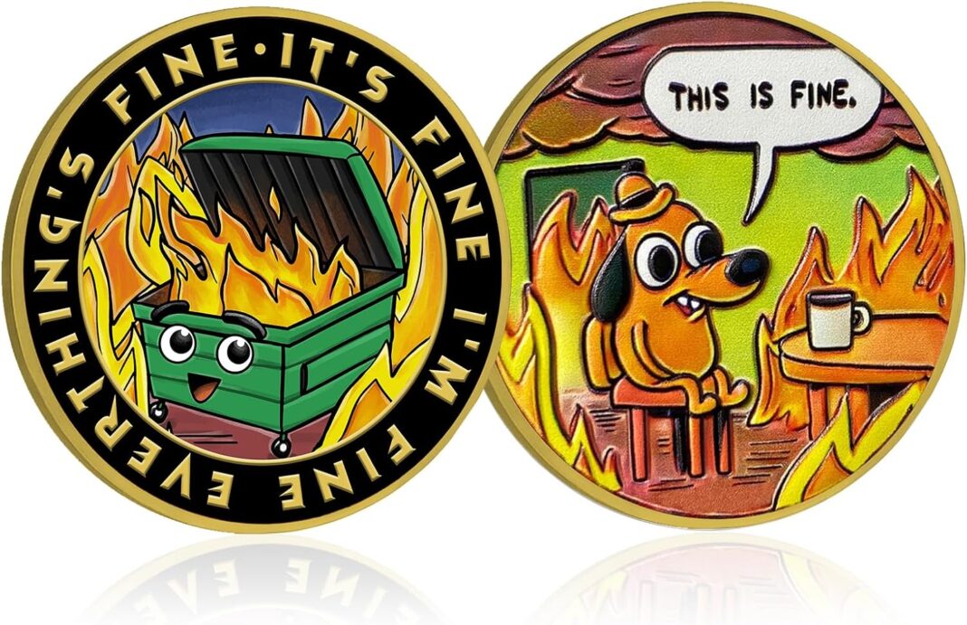 This vibrant challenge coin features a colorful dumpster on fire, symbolizing the chaos and humor of life’s unpredictable moments. The cheerful cartoon face adds a playful twist, reminding us to stay positive even when things spiral out of control. Whether for laughs or as a motivational keepsake, this coin brings a touch of levity and inspiration to any workspace. Our coin features a ouble-sided design. On one side, the dumpster fire takes center stage with the phrase: “EVERYTHING’S FINE · IT’S FINE · I’M FINE,” offering a humorous mantra for chaotic times. The reverse side depicts the iconic “This is Fine” dog calmly amidst flames, a perfect mix of irony and encouragement to face challenges with resilience and good humor. Crafted from zinc alloy-plated silver, this coin is both sturdy and lightweight. Measuring approximately 1.37″ in diameter and 0.12″ in thickness, it fits easily in your pocket, purse, or coin holder keychain. Each coin comes in a protective PP material case, ensuring it stays in pristine condition, making it ideal for gifting or collecting. This hilarious medallion makes an excellent gift for coworkers, employees, teachers, friends, and family**. It’s perfect for staff appreciation days, farewell gifts, promotions, graduations, and retirement celebrations**. Whether as a gag gift or a heartfelt token of recognition, it’s sure to spark smiles and brighten someone’s day. Combine this colorful coin with other funny desk decor, office accessories, or ‘everything is fine’ themed items to create a joyful and motivating workspace. It’s also a thoughtful collectible for firefighters, first responders, veterans, or anyone who appreciates humor and resilience in the face of life’s challenges.